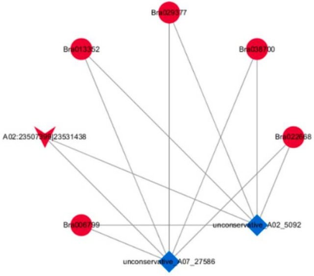 作者使用了TargetFinder來預測miRNA的靶基因,結合差異分析的結果最終得到170對miRNA和基因的調控關系,包含了18個miRNA和37個基因。對這些基因進行GO富集分析,發(fā)現(xiàn)主要是細胞過程、代謝過程等功能。對構建的網絡進行研究發(fā)現(xiàn)miRNA所調控的基因主要是涉及糖代謝、脂質代謝、花粉管生長等,同時也發(fā)現(xiàn)這些miRNA與植物激素相關,比如bra-miR9556-5p可能通過靶向Bra008715來參與水楊酸介導的信號通路和油菜素類固醇生物合成過程途徑。