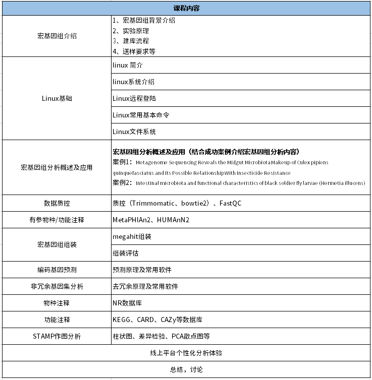本課程從宏基因組背景介紹、實驗(實驗測序原理、建庫方法和流程、送樣注意事項等)、分析(下機數據質控、有參注釋、無參組裝/預測/物種注釋/功能注釋等)、可視化作圖,讓您全面了解宏基因組分析每個過程,并結合案例文章,讓您了解宏基因組文章思路,助力科學研究。