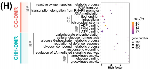 通過(guò)WGBS測(cè)序技術(shù)在10份野生大麥材料中共獲得1620Gb的cleandata,共鑒定出131408470個(gè)CG甲基化位點(diǎn)(mCG)(占所有CGs的94.7%)、 97714324個(gè)mCHGs位點(diǎn)(占所有CHGs的77.6%)和20576899個(gè)mCHHs位點(diǎn)(占所有CHHs的2.9%)。并且一共鑒定出121433個(gè)差異甲基化區(qū)域(DMRs),其中52306個(gè)CG-DMRs,30720個(gè)CHG-DMRs和38407個(gè)CHH-DMRs(圖C)。通過(guò)甲基化區(qū)域在染色體上的分布,作者發(fā)現(xiàn)CG-DMRs和CHH-DMRs兩種類型的差異甲基化區(qū)域在染色體的遠(yuǎn)端區(qū)域高度積累,并且主要集中在基因區(qū)和啟動(dòng)子區(qū),而CHG-DMRs的情況則和它們不同,不僅在染色體上分布相對(duì)均勻,并且基因區(qū)和啟動(dòng)子區(qū)的表達(dá)也相對(duì)比較低(圖A)。這些結(jié)果表明,CG-DMRs和CHH-DMRs可能在野生大麥兩個(gè)土壤種群的適應(yīng)性功能多樣化和基因區(qū)域調(diào)控中發(fā)揮重要作用。對(duì)CG-DMR基因和CHH-DMR基因進(jìn)行GO富集分析,發(fā)現(xiàn)CG-DMR主要富集在與基本過(guò)程相關(guān)的基因中,如ATP的產(chǎn)生、轉(zhuǎn)錄和翻譯,而CHH-DMR基因在代謝過(guò)程中富集,包括碳代謝、糖代謝和應(yīng)激反應(yīng)途徑(圖H)。