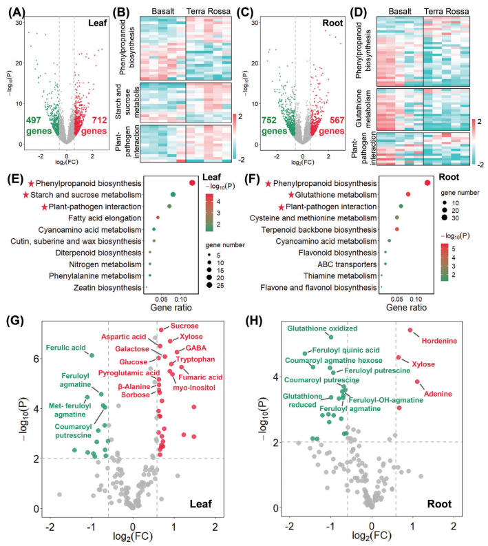(A、C)葉片和根中差異表達(dá)基因(DEGs)的火山圖。(B、D)deg的熱圖。E,F(xiàn))葉和根中DEGs的KEGG富集。(E,F(xiàn))葉和根中DEGs的KEGG富集。(G,H)代謝物水平倍數(shù)變化的火山圖。