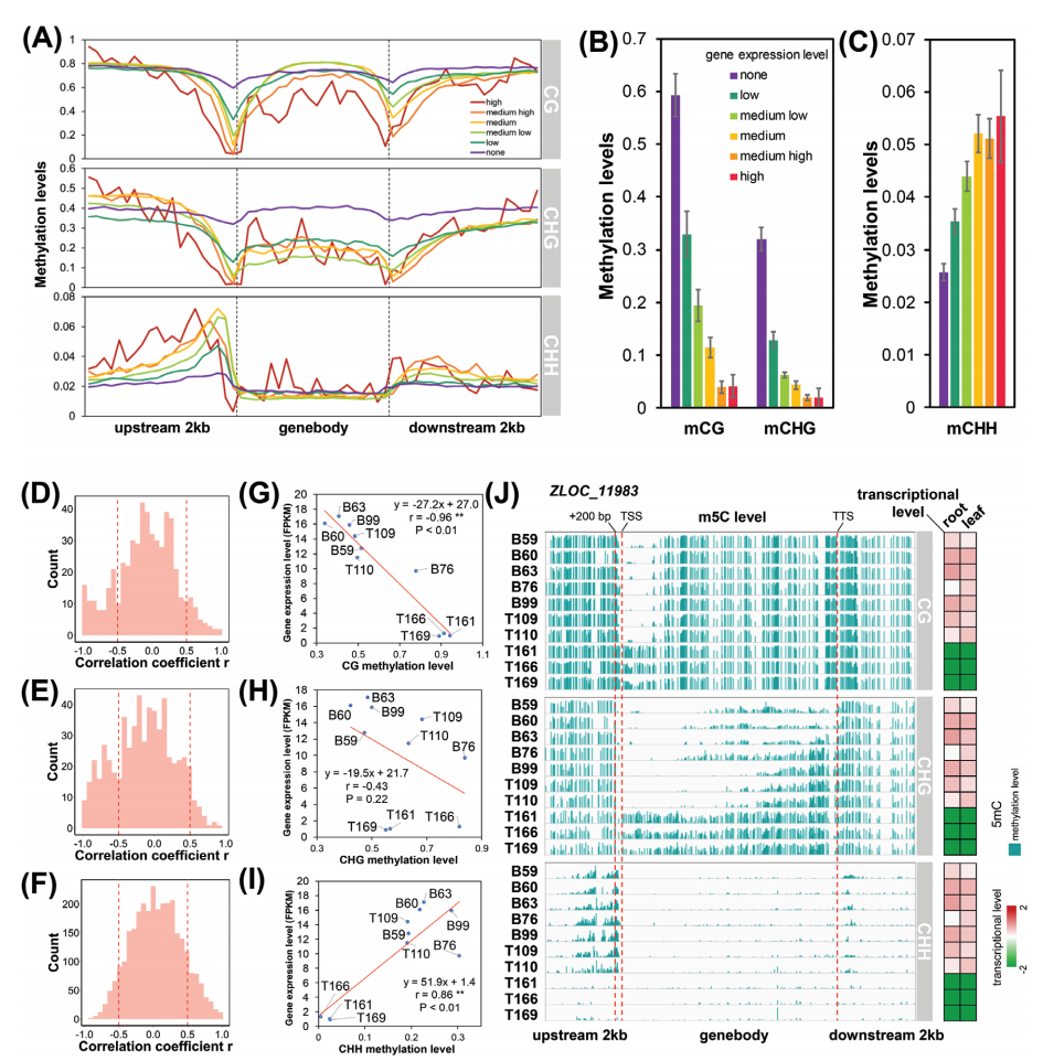 (A)被不同表達(dá)水平劃分的基因內(nèi)和側(cè)翼的甲基化水平。(B)TSS上游100bp的平均CG和CHG甲基化水平。(C)平均CHH甲基化水平TSS上游1000~200bp的水平。(D-F)m5C水平(D、mCG、E、mCHG、F、mCHH)與轉(zhuǎn)錄水平之間的Pearson相關(guān)系數(shù)分布。(G-I)m5C水平(G、mCG、H、 mCHG、I、mCHH)與ZLOC_11983轉(zhuǎn)錄水平的相關(guān)性分析。(J)m5C水平和ZLOC_11983的轉(zhuǎn)錄水平。