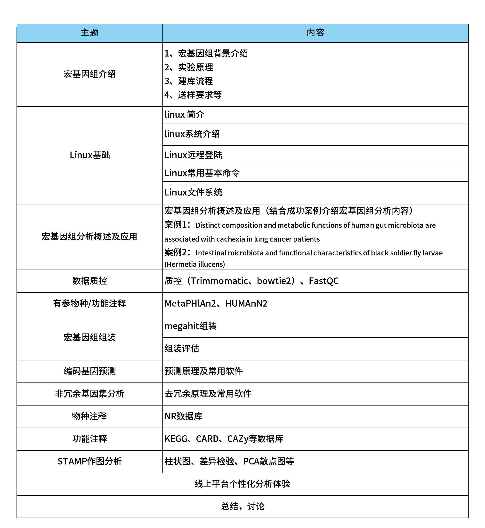 本課程從IF = 10及4分的SCI文章入手,從宏基因組背景介紹、實(shí)驗(yàn)(實(shí)驗(yàn)測序原理、建庫方法和流程、送樣注意事項(xiàng)等)、分析(下機(jī)數(shù)據(jù)質(zhì)控、有參注釋、無參組裝/預(yù)測/物種注釋/功能注釋等)、可視化作圖,讓您全面了解宏基因組分析每個(gè)過程,并結(jié)合案例文章,讓您了解宏基因組文章思路,助力科學(xué)研究。