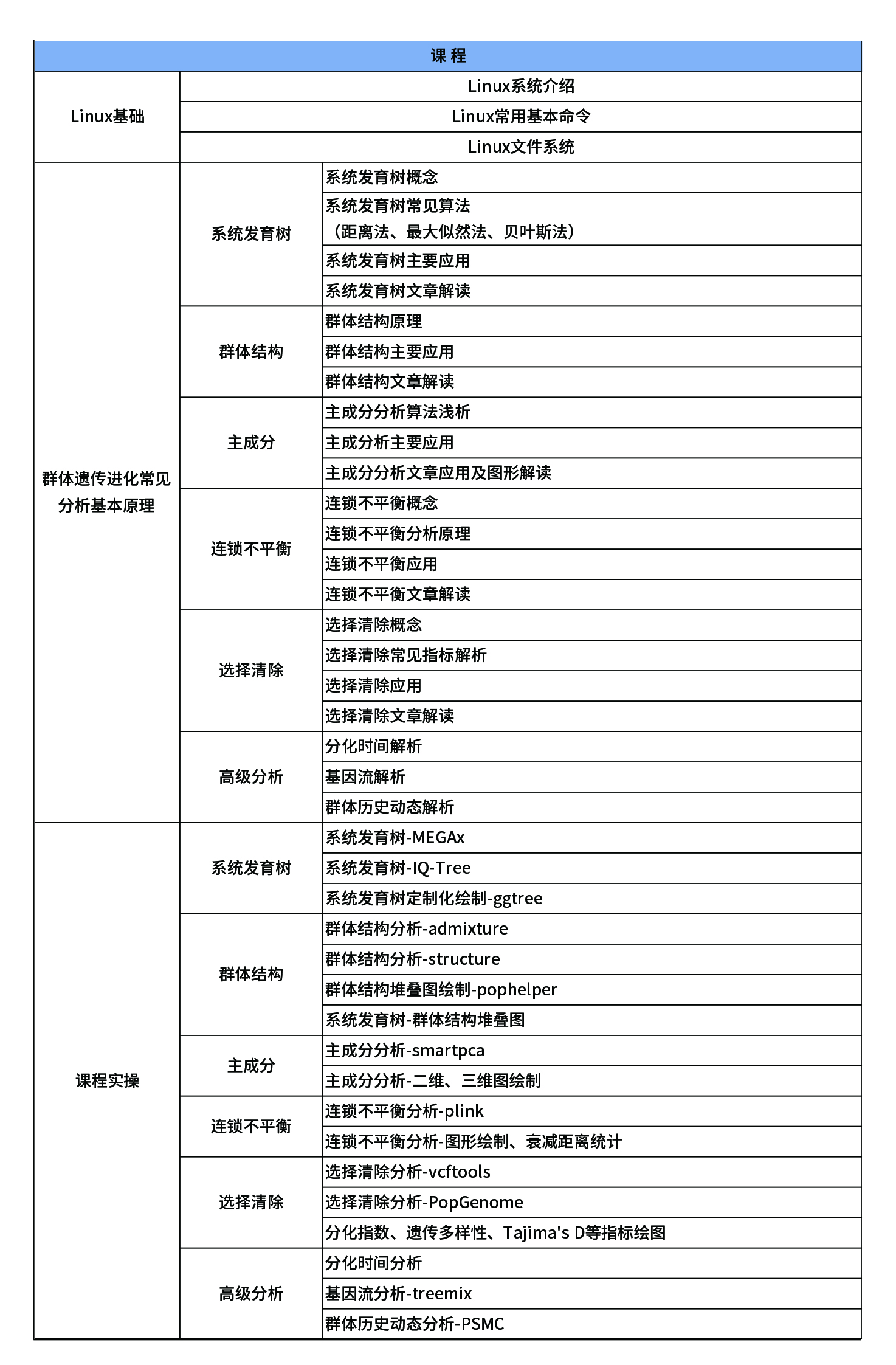 隨著測序技術(shù)的快速發(fā)展以及測序成本的極速下降,大規(guī)模的群體測序得以實(shí)現(xiàn)。拿到海量的測序數(shù)據(jù),如何研究材料的宏觀進(jìn)化、功能基因的定位,成為了阻礙眾多科研老師的一大障礙。本次課程梳理近年來高分文章行文思路,提取文章中遺傳進(jìn)化相關(guān)的常規(guī)分析內(nèi)容,同時(shí)涵蓋文章中的亮點(diǎn)分析(比如基因流、群體波動(dòng)史、時(shí)間分化等)。本次課程原理和實(shí)操相結(jié)合,偏重實(shí)操,免費(fèi)答疑,小型服務(wù)器免費(fèi)使用。