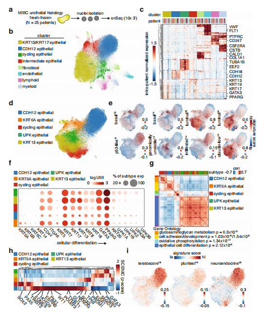 為了實現(xiàn)表征腫瘤內(nèi)異質(zhì)性的第一個目標,作者首先基于sn-RNAseq細胞類型比例研究了MIBC腫瘤的總體細胞組成(圖1a)。腫瘤由約90%的上皮細胞、5%的免疫細胞、3%的成纖維細胞和2%的內(nèi)皮細胞組成,這些細胞根據(jù)相應的角蛋白、PTPRC、膠原蛋白、PECAM1、VWF等關(guān)鍵標記基因(圖1b)。上皮間室無監(jiān)督聚類識別到了一個KRT13和KRT17差異表達的類群,KRT13、uroplakins(UPK)、KRT6A細胞周期相關(guān)基因類群,以及表達CDH12和其他上皮標記物的細胞群(圖1d)。KRT13和UPK人群是僅有的兩個缺乏來自免疫浸潤MIBC的基因標記的人群,這表明在這些人群中富集的腫瘤代表免疫“冷”腫瘤(圖1e)。進一步交叉參照傳統(tǒng)的尿上皮分化相關(guān)標記表明,KRT13和UPK群體代表一個更分化的表型,而CDH12、KRT6A和cycle群體代表一個未分化或去分化的表型(圖1f)。如預期一樣KRT13和UPK群體表達了一個上皮細胞分化網(wǎng)絡(圖1g)?;趩渭毎{(diào)控網(wǎng)絡推斷和聚類分析,預測CDH12群體表現(xiàn)出多種發(fā)育相關(guān)轉(zhuǎn)錄因子的高活性,包括NANOG、EOMES、PAX1和HOXD9(圖1h)。CDH12和循環(huán)群體在干-樣和神經(jīng)內(nèi)分泌基因標簽得分也高(圖1i)。