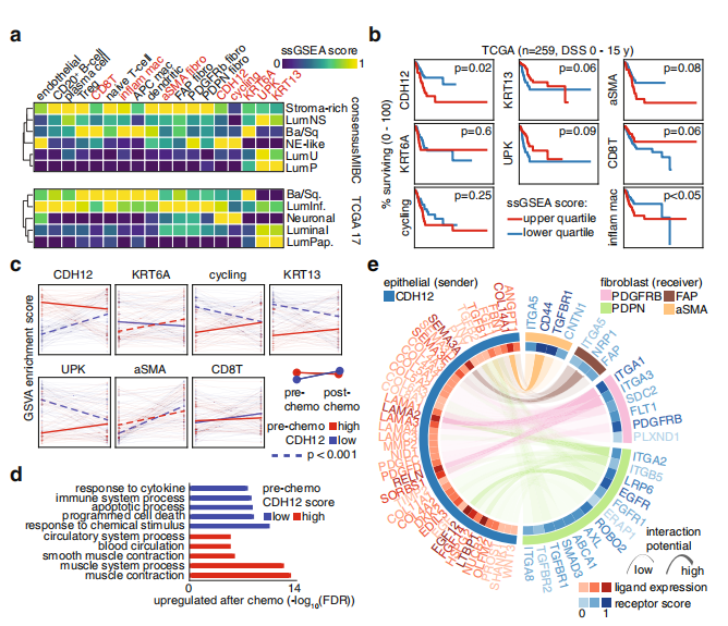 ? ? ? ? 有趣的是,在化療反應中,CDH12評分較低的腫瘤細胞凋亡和免疫激活相關(guān)基因表達增加,而CDH12評分較低的腫瘤細胞表達增加CDH12評分通過纖維母細胞和內(nèi)皮細胞活化對化療有反應(圖3d)。作者觀察到CDH12群體與成纖維細胞之間有許多顯著富集的相互作用,其中最顯著的是TGFBR1,CD44和一些整合素,因為它們參與了癌癥相關(guān)成纖維細胞(CAF)的激活(圖3e)。