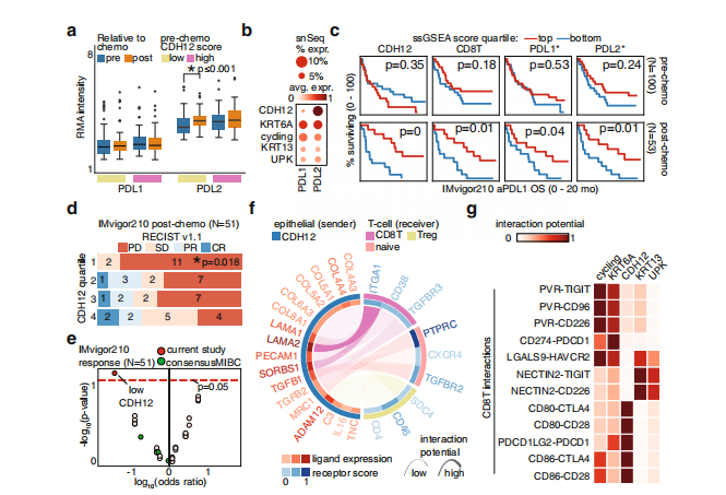 ? ? ? ? ? 通過免疫激活,作者發(fā)現(xiàn)低CDH12評分的腫瘤化療后PDCD1LG2(PDL2)表達增加,而在所有樣本中,PDL2表達高于PDL1(CD274)表達(圖4a)。之前的觀察與單細胞核轉(zhuǎn)錄組數(shù)據(jù)一致,顯示CDH12細胞在上皮細胞中表達了最高水平的PDL2(圖4b)?;熀蟮臉颖局?,CDH12水平預示著更好的OS(圖4c)。此外,只有在化療后,CD8T評分和PDL1和PDL2的表達顯示了顯著的預后價值(圖4c)。CDH12評分也與化療后的病理反應相關(guān),事實上,它是與化療后反應顯著相關(guān)的唯一因素,甚至考慮到已建立的一致MIBC亞型(圖4d和e)。