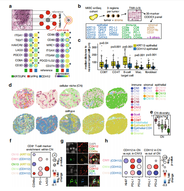 為了驗證CDH12上皮細胞引起T細胞假說,作者使用Visium空間轉(zhuǎn)錄組和單細胞核轉(zhuǎn)錄組研究腫瘤中基因表達定位。CDH12富集的區(qū)域也富集了CD8T細胞marker和ITGA1(圖5a)。為了驗證CDH12上皮細胞在單細胞水平上與T細胞共定位,作者設計并使用CODEX平臺對同一腫瘤隊列的腫瘤組織微陣列進行了35位免疫組化檢測(圖5b)。