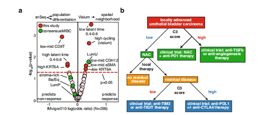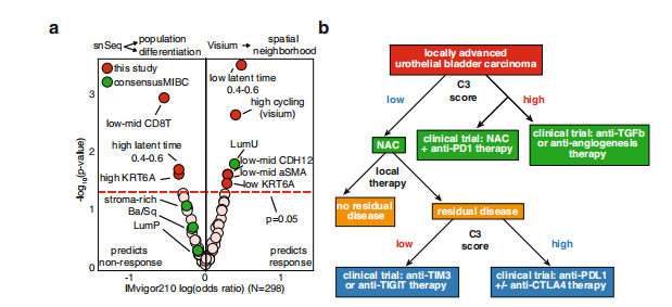 ? ? ? ? 總之,作者第一次進行了MIBC單細胞核轉(zhuǎn)錄組闡明當前分子亞型的組成,并獲得更高分辨率的具有治療相關(guān)性的分子標記。作者獲得了與特定細胞群、尿上皮分化和瘤內(nèi)空間鄰近相關(guān)的標記基因,這些標記基因提供了比先前基于bulk亞型更優(yōu)的治療相關(guān)性(圖6a)。通過這些發(fā)現(xiàn)作者推測基因表達譜可以幫助患者分類是否受益于NAC(圖6b)。NAC后腫瘤低C3評分可能受益于靶向替代免疫檢查點途徑如TIM3或TIGIT,而高表達的腫瘤可能受益于單藥或聯(lián)合ICT(圖6b)。還為一些基于NAC前C3的評分高的腫瘤患者以及NAC后殘留疾病患者臨床試驗提供了令人信服的理由(圖6b)。