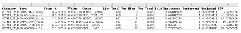 DAVID是一款免費的在線分析軟件,我們只需要準備一列基因名(gene list)。下載其結果,如下圖所示: