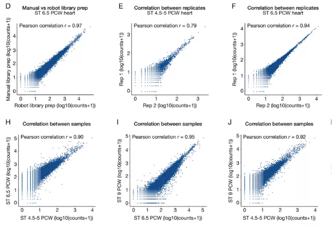 對同一樣本的 scRNA-seq 的基因表達(dá)數(shù)據(jù)與空間轉(zhuǎn)錄組的基因表達(dá)數(shù)據(jù)或者同一樣本的不同切片數(shù)據(jù)進(jìn)行 Pearson 相關(guān)性分析,從而評估技術(shù)重復(fù)之間的相似性[1]。