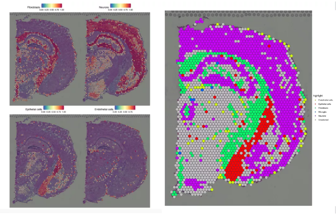 注:左圖展示單獨(dú)各個細(xì)胞類群在空間的分布情況,右圖為空間組織切片每個spot的細(xì)胞類型展示圖,不同顏色表示不同的細(xì)胞類型