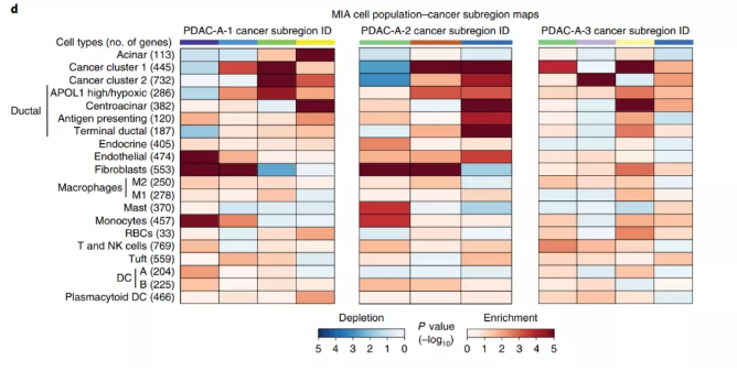 注:熱圖行表示個細(xì)胞類型,列為空間組織區(qū)域,紅色表示富集,藍(lán)色表示缺失