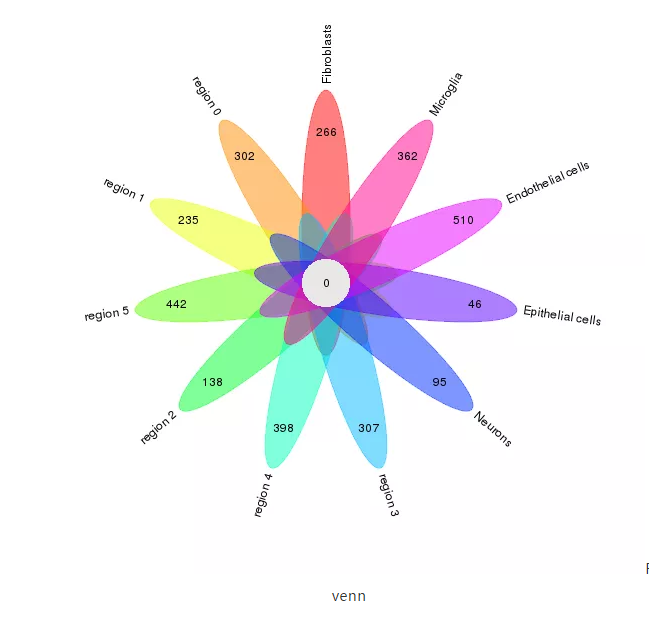 注:每個花瓣上的數(shù)字表示該細(xì)胞亞群或組織區(qū)域的差異基因總數(shù),中間圓心的數(shù)字表示所有細(xì)胞亞群與組織區(qū)域的交集基因數(shù)