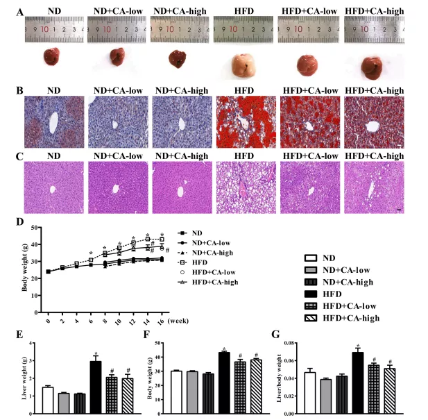 ND組小鼠隨機(jī)分為3組(n = 10),飼喂特定飼料,為期8周。這些組包括:1)喂食正常食物的ND小鼠;2)低ND+CA,喂食CA含量為0.08%的正常鼠糧;3)高ND+CA,喂食CA含量為0.16%的正常飼料。同時(shí),高脂飲食組按以下飼