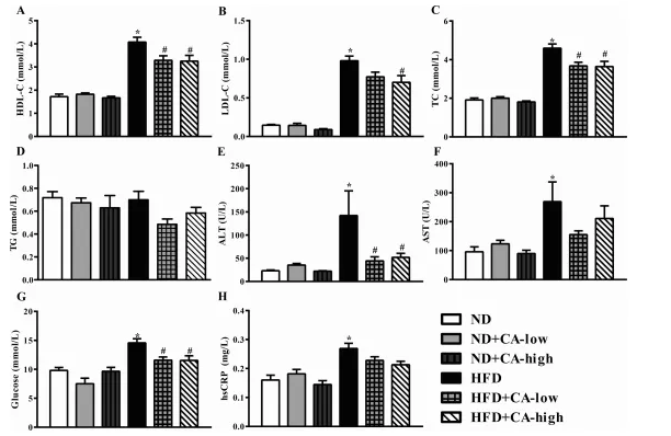 血清TC、TG、HDL-C和LDL-C升高是HFD組小鼠的主要特征。同樣,HFD組小鼠血清TC、HDL- C、LDL-C水平明顯升高,提示小鼠出現(xiàn)高脂血癥。CA處理在低和血清TC、TG、HDL-C和LDL-C升高是HFD組小鼠的主要特征。同樣,HFD組小鼠血清TC、HDL- C、LDL-C水平明顯升高,提示小鼠出現(xiàn)高脂血癥。CA處理在低和低濃度的TC、HDL-C和LDL-C對(duì)hfd誘導(dǎo)的血清高脂血癥有緩解作用。但各組間血清TG水平無(wú)顯著差異(圖2A-D)。在HFD組中,ALT、AST、葡萄糖和hsCRP水平均升高,而在喂食HFD的小鼠中,添加兩種濃度的CA只恢復(fù)了血清中ALT和葡萄糖(圖2E-H)。添加CA的ND小鼠與只添加ND的小鼠表現(xiàn)出幾乎相同的結(jié)果。