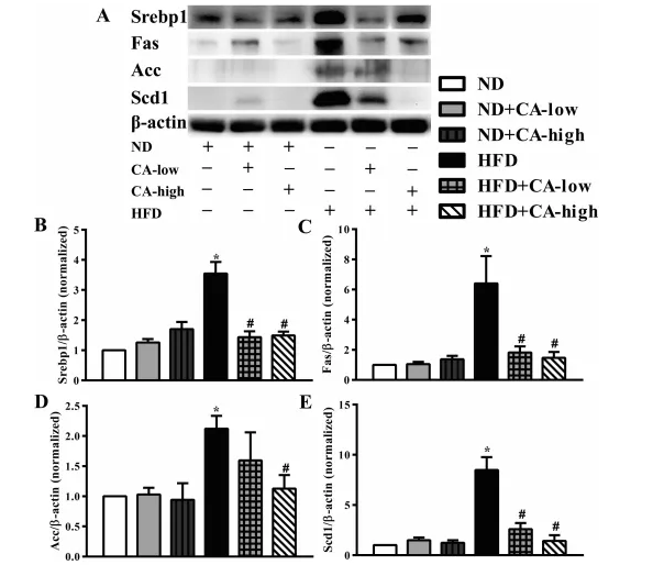 3.補(bǔ)充CA可調(diào)節(jié)高脂喂養(yǎng)小鼠脂肪生成相關(guān)蛋白表達(dá)