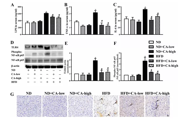 有報(bào)道稱,NAFLD的特征是腸道菌群改變、炎癥和腸道屏障破壞。肝組織炎癥被認(rèn)為是肝脂肪變性發(fā)展的驅(qū)動(dòng)因素,腸道源性脂多糖被認(rèn)為在肝臟炎癥中具有致病作用。最近的動(dòng)物實(shí)驗(yàn)研究關(guān)注了腸道菌群LPS在NAFLD發(fā)生中的作用。腸道源性LPS是革蘭氏陰性菌外膜的主要成分,通過(guò)TLR4信號(hào)通路和下游炎癥級(jí)聯(lián)反應(yīng)促進(jìn)炎癥反應(yīng)。有報(bào)道稱,在NAFLD模型中,與野生型小鼠相比,tlr4缺陷小鼠的肝損傷、炎癥和脂質(zhì)積累減少。此外,阻斷腸道菌群與宿主細(xì)胞之間的脂多糖- tlr4相互作用可以阻止高脂喂養(yǎng)小鼠NAFLD的啟動(dòng)和發(fā)展,這證實(shí)了脂多糖- tlr4通路在誘導(dǎo)NAFLD中具有非常重要的作用。與之前的研究結(jié)果一致,我們的研究表明,16周高脂飲食導(dǎo)致血清LPS和肝臟TLR4表達(dá)顯著增加,肝組織中磷酸化的NF-kB p65被激活,表明炎癥開(kāi)始。同時(shí),高脂喂養(yǎng)小鼠血清TNF-a、IL-6水平升高,肝臟mpo陽(yáng)性細(xì)胞浸潤(rùn)。所有劑量的CA補(bǔ)充均顯著扭轉(zhuǎn)了上述現(xiàn)象;在添加ca的ND組中沒(méi)有觀察到顯著差異(圖4A-G)。