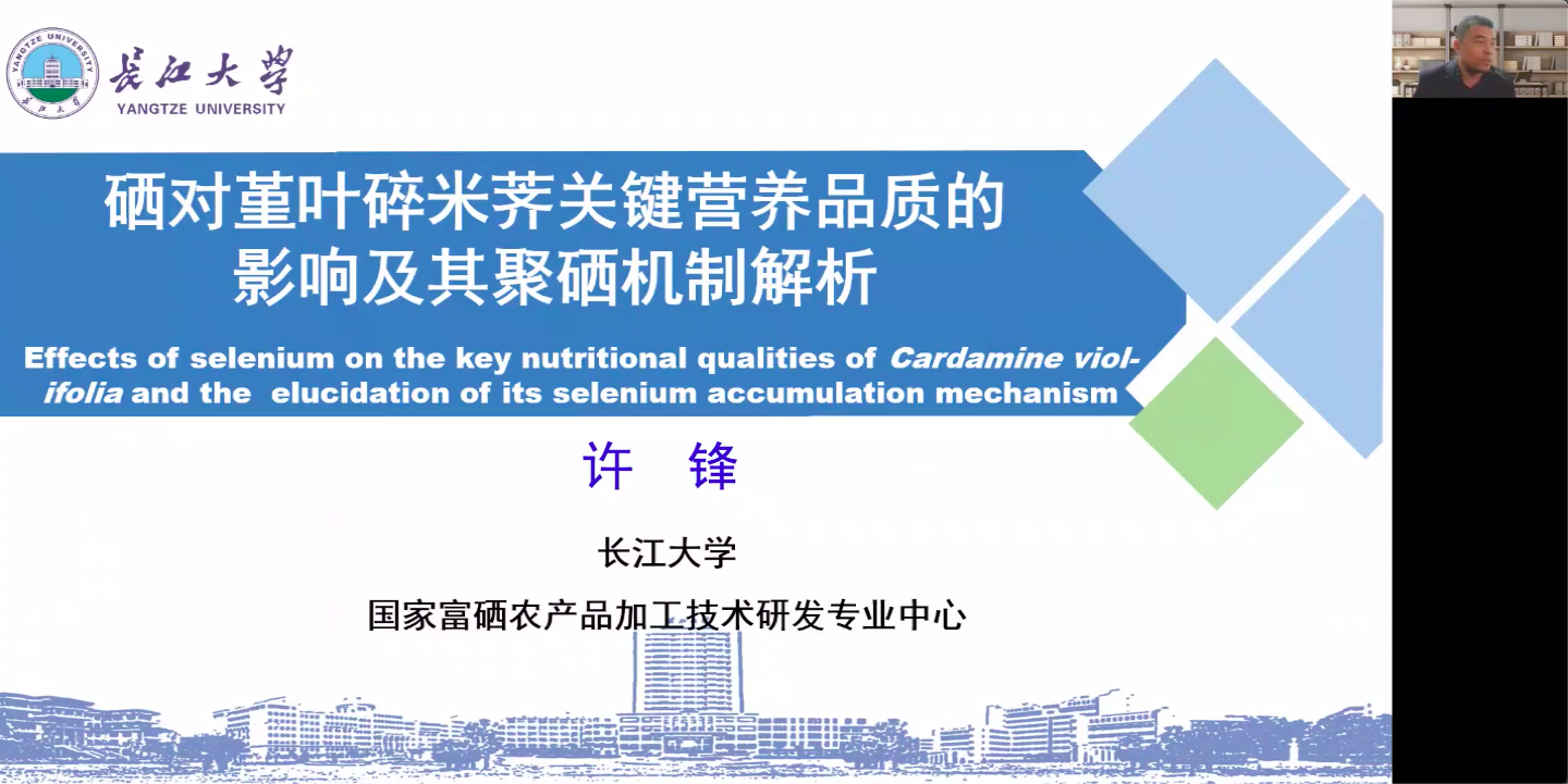 長江大學(xué)許鋒教授首先報(bào)告了外源硒處理下,堇葉碎米薺在幼苗期和成熟期都積累高含量的硒;然后講解了不同濃度的硒處理下,通過轉(zhuǎn)錄組、蛋白組和代謝組解析堇葉碎米薺的分子機(jī)制的研究工作,認(rèn)為相關(guān)基因的表達(dá)變化減少了硫元素消耗,優(yōu)化了硫元素利用,可能是堇葉碎米薺耐硒的重要原因。