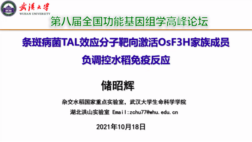 武漢大學(xué)生命科學(xué)學(xué)院儲(chǔ)昭輝教授報(bào)告了其團(tuán)隊(duì)在水稻和條斑病菌互作上的研究進(jìn)展,講解了HGA4菌株致病力更強(qiáng)的原因是其比RS105菌株包含更多TAL效應(yīng)因子,并且表明Tal2b、Tal2c是兩個(gè)致病因子,它們通過分別靶向調(diào)控水稻中OsF3H03g、OsF3H04g基因進(jìn)而調(diào)控水稻對(duì)條斑病的抗性,最后展示了對(duì)其進(jìn)行的一系列功能驗(yàn)證與分子機(jī)制研究。