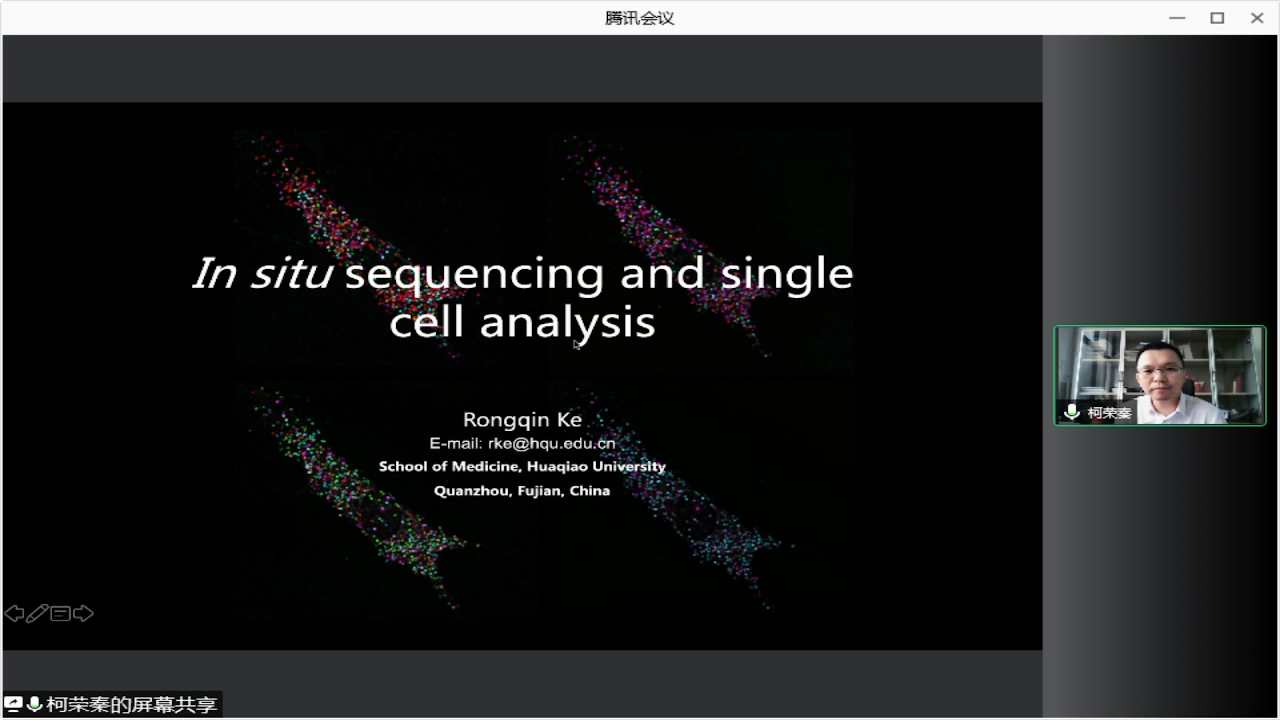 午后休息結(jié)束,華僑大學(xué)醫(yī)學(xué)院柯榮秦教授帶來的報告是:原位測序技術(shù)與單細(xì)胞分析。基于單細(xì)胞測序的基因表達(dá)分析需要將單個細(xì)胞從組織中分離出來,這個過程使所分析的單細(xì)胞丟失了空間位置信息??吕蠋焾F(tuán)隊開發(fā)了原位測序(in situ sequencing, ISS),是一種基于成像的空間轉(zhuǎn)錄組學(xué)技術(shù)。該技術(shù)可以在細(xì)胞甚至亞細(xì)胞分辨率下提供低通量到高通量的空間基因表達(dá)信息,將ISS技術(shù)應(yīng)用于癌癥組織中基因表達(dá)異質(zhì)性的可視化分析,并將之應(yīng)用于人腦組織單細(xì)胞測序所獲得的感興趣的基因的定位以補充其失去的空間位置信息。此外,還開發(fā)了一系列新型的具有更高的檢測靈敏度和更好的分辨率的單分子RNA原位雜交方法,可以在細(xì)胞和組織中對感興趣的RNA轉(zhuǎn)錄本進(jìn)行原位成像分析。我們相信我們所開發(fā)的原位RNA表達(dá)分析技術(shù)具有廣泛地用于生物和醫(yī)學(xué)的研究的潛力。