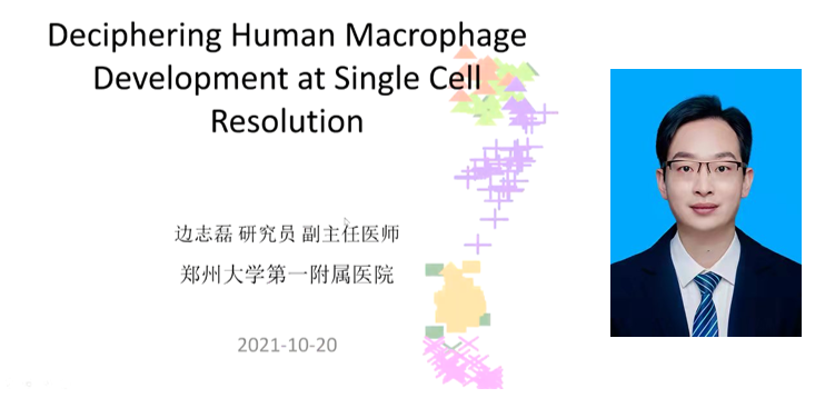 前面兩場報告湯老師和曹老師都是開發(fā)了單細(xì)胞空間新技術(shù),這些技術(shù)如何實現(xiàn)在臨床醫(yī)學(xué),特別是在腫瘤中精準(zhǔn)輔助治療應(yīng)用呢?鄭州大學(xué)第一附屬醫(yī)院血液科副主任醫(yī)師邊志磊研究員報告題目是:Deciphering human macrophage development at single-cell resolution,以超高單細(xì)胞分辨率深度解析了巨噬細(xì)胞發(fā)育。邊老師團(tuán)隊繪制了巨噬細(xì)胞在多個解剖部位的異質(zhì)性,并確定了不同的亞群,包括各種類型的胚胎組織駐留巨噬細(xì)胞(TRMs)(在頭部、肝臟、肺和皮膚)。追蹤了胚胎卵黃囊來源的原始巨噬細(xì)胞或卵黃囊衍生的偏髓性祖細(xì)胞(YSMPs)來源的胚胎肝單核細(xì)胞中TRM的發(fā)育軌跡,評估了胚胎期TRM和成年期TRM之間的分子相似性。全面描述了人類胚胎發(fā)生過程中早期巨噬細(xì)胞發(fā)育的時空動態(tài)特征,為進(jìn)一步研究人類TRM的發(fā)育和功能提供了參考。