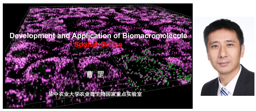 聆聽完湯老師的報告是不是意猶未盡,接下來第二位出場報告嘉賓是華中農(nóng)業(yè)大學(xué)楚天學(xué)者特聘教授,曹罡教授,曹老師的報告題目是:Development and Application of Single cell Biomacromolecule Spatail-Omics。。曹老師團(tuán)隊開發(fā)了一系列的單細(xì)胞生物大分子原位組學(xué)檢測新技術(shù),包括(單細(xì)胞)三維基因組學(xué)、單細(xì)胞原位測序技術(shù)、新型中低通量單分子FISH技術(shù)、蛋白互作網(wǎng)絡(luò)及其高通量空間定位技術(shù)和結(jié)合神經(jīng)環(huán)路的單細(xì)胞測序技術(shù)。同時,并將這些技術(shù)運用到神經(jīng)免疫學(xué)與病原感染、腫瘤等疾病的發(fā)生發(fā)展及其檢測研究中,極大的拓展了單細(xì)胞生物大分子空間組學(xué)的發(fā)展與應(yīng)用。