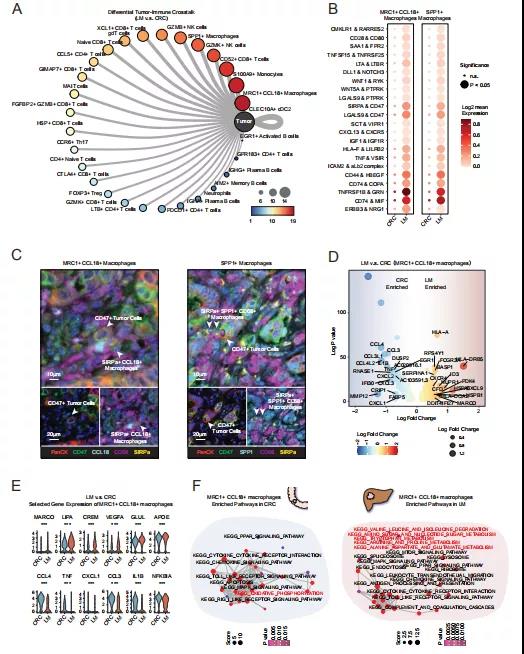 本研究進行了基于配體-受體的癌癥-免疫串擾分析,并在原發(fā)部位和轉移部位之間進行比較(圖 2A),發(fā)現(xiàn)SPP1+巨噬細胞和MRC1+ CCL18+巨噬細胞在LM和CRC之間的差異較大,這一結果表明肝轉移癌細胞可能優(yōu)先重編程巨噬細胞并誘導其特定的功能狀態(tài)(圖 2A)。值得注意的是,LM中的轉移性腫瘤細胞優(yōu)先表達配體CD47,這是一個重要的檢查點,因此可能招募相應的受體SIRPA或激活MRC1+ CCL18+巨噬細胞(圖 2B)。進一步利用mIHC來可視化這些蛋白質(zhì),觀察CD47+腫瘤細胞和SIRPA+巨噬細胞之間的串擾(圖 2C)。這些配體-受體對為靶向治療肝轉移提供了線索。