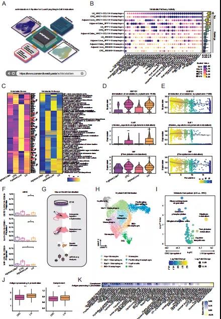 為了說明代謝重編程與巨噬細胞表型變化的關聯(lián),本研究計算了巨噬細胞的經(jīng)典通路評分,例如抗原加工、呈遞、炎癥、血管生成、免疫抑制、吞噬作用、白細胞介素信號通路和補體評分(圖 3J)。在LM中,MRC1+ CCL18+巨噬細胞的抗原加工和呈遞以及補體活性評分顯著增加(圖 3J),SPP1+巨噬細胞也顯示出類似的趨勢。某些基因如HLA-A(MHC I類分子之一)在LM的MRC1+ CCL18+巨噬細胞中上調(diào)。進一步分析了42種腫瘤高代謝途徑與MRC1+ CCL18+巨噬細胞通路評分之間的相關性,發(fā)現(xiàn)包括戊糖和葡萄糖醛酸互變在內(nèi)的幾種巨噬細胞特異性代謝途徑與LM中的抗原加工和呈遞有很強的相關性,但在CRC的相關性很弱(圖 3K)。這些數(shù)據(jù)表明不同的代謝功能在MRC1+ CCL18+巨噬細胞表型中的潛在作用。
