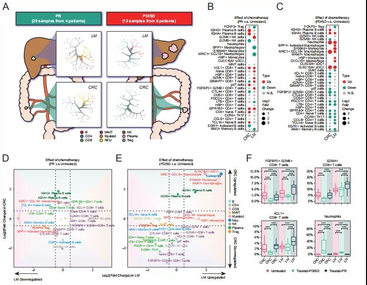來自未治療患者(n = 11)的79,703個細胞、來自NAC PD/SD患者(n = 5)的36,284 個細胞和來自NAC PR患者的62,643個細胞(n = 4)用于進一步分析。每個樣本平均包含2,007個細胞,每個細胞中1,064個基因(中位數(shù)),在不同樣本之間沒有明顯的批次效應。整合所有178,630個CD45+細胞,進行了聚類分析,并使用SingleR和細胞marker基因注釋主要細胞類型。與之前的結腸癌scRNA-seq基本一致,本研究從CRLM樣本中鑒定到了骨髓細胞、CD8+ T細胞、CD4+ T細胞、NK細胞和B細胞(圖 1B、1C)。值得注意的是,不同組織類型的T細胞比例明顯不同,表明免疫微環(huán)境的組織異質(zhì)性(圖 1D)。CRC和配對LM樣本中所有CD45+細胞中Treg細胞約占10%,而這些細胞在相鄰的正常組織中很少見,這表明腫瘤內(nèi)免疫受到抑制,這之前被歸因于肝轉移中免疫治療效果降低。同樣,本研究整合了SingleR和基于marker基因的手動注釋,進一步注釋了免疫細胞亞群(圖 1E)。