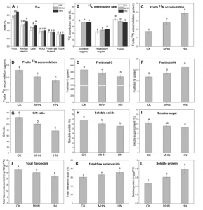 實驗材料:紅富士蘋果(7齡;中國東北部山東省煙臺市)。對照組CK:正常尿素處理組(300 kg N/hm2,每棵樹435 g尿素);實驗組MHN:中高氮處理組(600 kg N/hm2,每棵樹870 g尿素);實驗組HN:高氮處理組(800 kg N/hm2,每棵樹1160 g尿素)。在開花后183天進行13C標記。