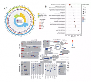 共獲得5340個蛋白質(zhì),與對照相比,795個DEPs在HN中顯示出顯著變化,其中422個蛋白上調(diào),373個蛋白下調(diào)。GO富集分析顯示氧化作用?還原過程和應激反應富含更多的蛋白質(zhì),而下調(diào)的蛋白質(zhì)富集程度更高(圖3A)。KEGG分析發(fā)現(xiàn)C代謝、丙酮酸代謝、糖酵解/糖異生、三羧酸(TCA)循環(huán)、次級代謝產(chǎn)物生物合成和氨基酸生物合成途徑顯著富集(圖3B)。MapMan分析結(jié)果顯示許多DEP參與主要和次要CHO代謝、糖酵解、TCA循環(huán)、氨基酸代謝和次級代謝,并且大多數(shù)這些蛋白質(zhì)被發(fā)現(xiàn)下調(diào)(圖3C)。