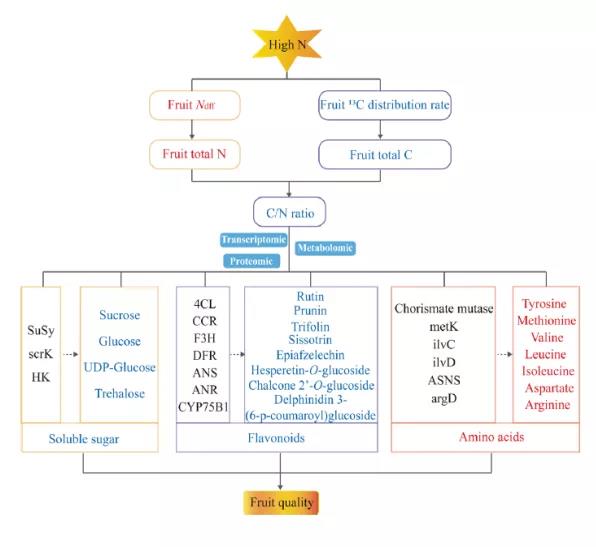 高氮增加了果實對15N的吸收和調(diào)節(jié)能力,降低了C在果實中的分配率,從而導致蘋果果實的總N增加,總C和C/N比率降低。高氮破壞了蘋果C?N平衡,降低了蘋果果實的可溶性糖和總黃酮含量,進而使果實品質(zhì)惡化。基于多組學分析,揭示了高氮對初級代謝和次級代謝互作網(wǎng)絡(luò)。高氮調(diào)節(jié)了蘋果果實中基因和蛋白質(zhì)的表達,抑制了碳水化合物和黃酮類化合物的積累,更多的碳骨架被用來合成氨基酸及其衍生物并轉(zhuǎn)移到氮代謝中。本研究揭示了高氮導致蘋果果實糖和類黃酮含量下降的機理,并獲得了關(guān)鍵候選基因和蛋白質(zhì)。