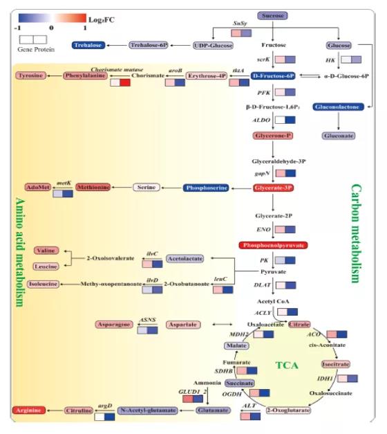 C代謝包括淀粉和蔗糖代謝、糖酵解和TCA循環(huán)。高氮總體下調(diào)了C代謝中蛋白質(zhì)(Susy、scrK和HK)的豐度和碳水化合物(蔗糖、葡萄糖和海藻糖)的積累。相反,糖酵解中間產(chǎn)物卻明顯積累,如甘油-P、甘油酸-3P和磷酸烯醇式丙酮酸。這表明蛋白質(zhì)(ALDO、gapN和ENO)與這些中間代謝物之間存在負相關(guān)。糖酵解亞型的增加表明,高氮加速了C在呼吸途徑中的流動。氨基酸與碳代謝密切相關(guān),是氮分配的主要形式。氨基酸生物合成途徑中的大多數(shù)蛋白質(zhì)表達下調(diào)(脊索酸變位酶除外),而大多數(shù)氨基酸及其中間產(chǎn)物表達上調(diào)(圖5)。以前的研究表明,隨著氮供應的增加,非結(jié)構(gòu)性碳水化合物中的一部分C被并入氨基酸和蛋白質(zhì)中。以氨基酸形式的氮增加,使氮儲存更具成本效益。因此,C向N代謝的轉(zhuǎn)移是導致高氮條件下碳水化合物減少的一個重要因素,這使得水果中氨基酸和總氮含量的顯著增加。甘油酸-3P和磷酸烯醇式丙酮酸的增加是氨基酸生物合成所需C骨架增加的重要指標。