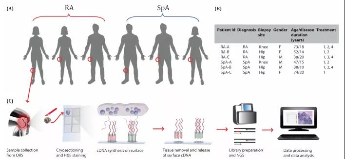 類風(fēng)濕性關(guān)節(jié)炎(RA)和脊椎關(guān)節(jié)炎(SpA)是常見的慢性炎癥性疾病,其特征是關(guān)節(jié)發(fā)炎,兩種疾病中炎癥關(guān)節(jié)的特征是白細(xì)胞浸潤以及間充質(zhì)細(xì)胞的局部增殖。臨床上,RA和SpA被認(rèn)為是復(fù)雜的自身免疫性疾病。目前對炎癥通路的理解主要基于對滑液和滑膜活檢材料的研究,但它們都顯示出高度的細(xì)胞組成異質(zhì)性,因此免疫組化(IHC)是活檢研究的changyong方法。然而,近年來轉(zhuǎn)錄組學(xué)已發(fā)展成為研究混合成分細(xì)胞調(diào)節(jié)分子途徑的一種更常見的方法,特別是單細(xì)胞轉(zhuǎn)錄組,這些方法雖然獲得的信息量大,但主要集中在來自同質(zhì)化組織或單細(xì)胞懸浮液的細(xì)胞,并沒有揭示疾病病灶的空間信息。