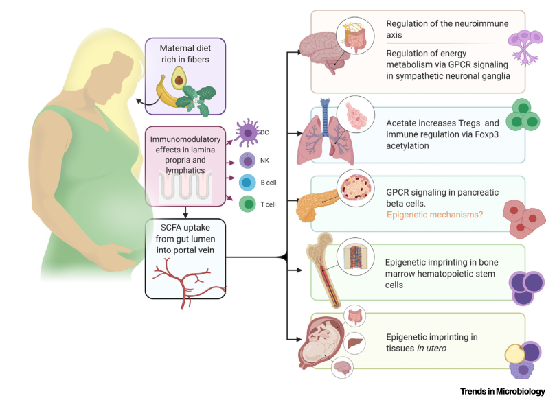 圖1.短鏈脂肪酸(SCFA)對腸道以外的器官和組織的影響,包括發(fā)育中的胎兒。富含不可消化纖維的飲食可促進微生物發(fā)酵和結腸中SCFA的產(chǎn)生,從而通過直接作用于腸道上皮細胞和免疫細胞來促進粘膜動態(tài)平衡。[2]