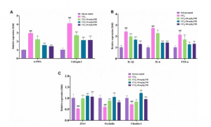 首先,作者分析了α-SMA和Collagen I的mRNA表達(dá)情況。如圖10A所示,與溶劑對(duì)照組相比CCl4組α-SMA和Collagen I表達(dá)顯著升高。隨后研究了IL-1β、IL-6和TNF-α 三種炎癥因子mRNA表達(dá)情況。如圖10B所示,與溶劑對(duì)照組相比CCl4組肝臟IL-1β、IL-6和TNF-α mRNA表達(dá)水平升高。