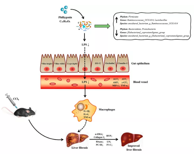 連翹素(PHI)具有良好的保肝作用,通過(guò)TLR4/MyD88/NF-κB信號(hào)通路抑制脂多糖誘導(dǎo)的促炎反應(yīng)和LX2細(xì)胞的激活,從而緩解肝纖維化。此外,鑒于腸道菌群在肝纖維化發(fā)展過(guò)程中的重要作用,PHI的抗纖維化作用是否部分依賴于腸道菌群失調(diào)的調(diào)節(jié)尚不清楚。
