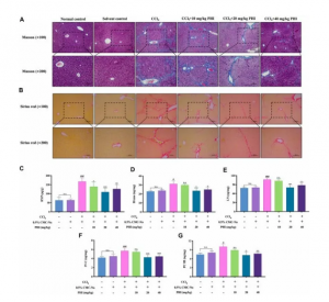 觀察纖維組織分布、Masson染色及Sirius red染色。如圖3A和B所示,Masson染色時(shí)膠原纖維呈藍(lán)色,Sirius red染色時(shí)呈紅色。結(jié)果表明,正常對(duì)照組和溶劑對(duì)照組幾乎不產(chǎn)生膠原纖維,而CCl4可誘導(dǎo)產(chǎn)生大量的膠原纖維。有趣的是,PHI處理顯著減少了肝臟中膠原的積累。