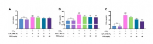 為了評(píng)價(jià)PHI的抗炎作用,作者檢測(cè)了血清中LPS、MIP-1和TNF-α的水平。如圖5所示,正常對(duì)照組與溶劑對(duì)照組LPS、MIP-1和TNF-α水平差異不顯著。與溶劑對(duì)照組相比,CCl4組LPS、MIP-1和TNF-α水平顯著升高。20和40mg/kg PHI可顯著降低LPS、MIP-1和TNF-α水平。