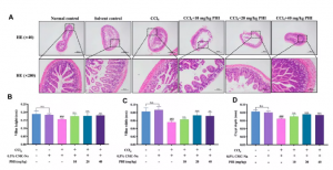 此外,作者測(cè)量了各組小鼠回腸絨毛高度、寬度和隱窩深度,結(jié)果如圖6B-D所示。正常對(duì)照組與溶劑對(duì)照組無(wú)明顯差異。與溶劑對(duì)照組相比,CCl4組回腸絨毛高度、寬度和隱窩深度顯著減少。PHI(20和40mg/kg)處理后上述指標(biāo)減少均可逆轉(zhuǎn)。綜上所述PHI可以顯著改善腸道損傷。