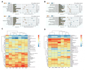 作者通過(guò)KEGG和COG數(shù)據(jù)庫(kù)預(yù)測(cè)了微生物的功能(圖9A和B)。CCl4處理組富集的通路為energy production and conversion、membrane transport和signal transduction mechanisms。肝纖維化小鼠PHI處理后,微生物富集的通路為carbohydrate transport and metabolism、lipid transport and