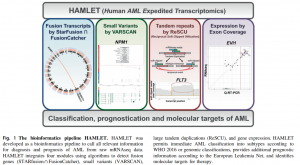 然而,急性髓細胞白血病的z確分類需要不同的技術來捕獲結構多樣的基因突變,如較大的插入和缺失(indels)、融合基因和除小變異外的結構性染色體變異。此外,結構正?;虻谋磉_水平可對預后產生決定性影響。因此,在當前的技術平臺下,急性髓細胞白血病診斷及風險評估仍然繁瑣、貴,且不完整。為了解決這一需求,我們實施了全轉錄組RNA測序(mRNAseq),作為獲取與當前和未來分類和風險分類相關的所有遺傳信息的單一平臺。在這種診斷范式中,一個經認可的mRNAseq協議獲取診斷樣本的全面數據。對于單次運行數據分析,我們開發(fā)了一個指定的集成生物信息管道(人類急性髓細胞白血病快速轉錄組學(HALLET);Fig. 1)。HAMLET具有靈活的適應性和個性化,可以查詢一組選定基因的序列變異和表達水平,以及易位情況。