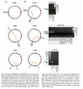 HAMLET提供了融合轉錄物的詳細信息,包括差異剪接(KMT2A-MLLT3、RUNX1-RUNX1T1、PML-RARA、CBFB-MYH11和NUP98-NSD1)和來自平衡易位的相互轉錄物,例如,RARA-PML, ERG-FUS, NUP214-DEK, 和 NSD1-NUP98。總之,HAMLET檢測到54種不同的融合轉錄本,這些轉錄物不能通過中期核型分析預測??偟膩碚f,28例急性髓系白血病攜帶兩個或多個融合,在一個復雜的AML中*多有9個不同的融合基因。