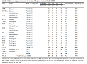 HAMLET的VARSCAN組件在13個AML基因中鑒定出246個小變異體。HAMLET對NPM1和DNMT3A的FLT3-ITD和熱點區(qū)域進行了敏感性評估,對其余的418個被HAMLET稱為野生型的樣本進行了靶向重測序反應。VARSCAN只識別了七個相當短的FLT3-34人中的ITDFLT3-ITD攜帶AML。在這種情況下,HAMLET都正確地識別了一個ASXL1(3-030)的30bp C末端插入和CEBPA (3-003)中一個N端易位。HAMLET檢測到的小變異體的總體類型和分布與在COSMIC中報告的分布非常一致。