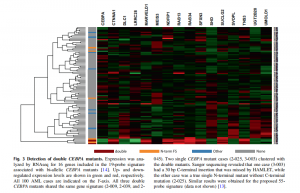 等位基因的CEBPA突變?yōu)楹诵驼5腁ML帶來了良好的預后并且將一個等位基因上編碼序列的第一個357 bp內的N-末端移碼突變與c.834-1074之間的C-末端框內插入或缺失相結合,從而破壞另一個等位基因上的DNA結合。通過Illumina平臺上通??色@得的reads長度來證明它們在相反染色體上的位置。然而,雙等位基因CEBPA突變與特定的基因表達譜有關?;趍RNAseq的基因表達譜顯示了特征性的雙等位基因CEBPA攜帶兩個樣本的所有四個急性髓系白血病樣本的突變相關特征CEBPA突變(2-009、2-039、2-045和3-003),包括其C端突變被HAMLET遺漏的病例3-003(圖3)。11例急性髓系白血病中,有一例CEBPA變異,一個病例(2-025)的特征性N-末端移碼突變與雙聚在一起CEBPA變異。因此,將變異檢測與基因表達譜結合分析,可以單獨解決變異檢測的不確定性。由于CEBPA 雙突變體的基因標記不是定量的,所以尚未在HAMLET中實施臨床應用。