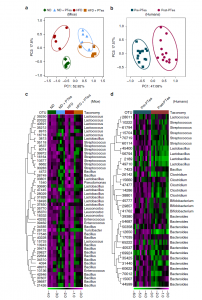 普洱茶是中國(guó)一種傳統(tǒng)發(fā)酵茶,對(duì)高膽固醇血癥,高脂血癥,肥胖,肝病等具有衰減和逆轉(zhuǎn)作用。在茶葉發(fā)酵過(guò)程中,TB濃度大幅度上升,說(shuō)明TB(茶褐素)是普洱茶的特征成分。文章通過(guò)將雄性鼠(C57BL6/J)分為ND(正常飼料)組和HFD(高脂飼料)組分別飼養(yǎng),并為每組小鼠中的一半小鼠提供普洱茶。研究表明ND+PTea(正常飼料,普洱茶)和HFD+PTea(高脂飼料,普洱茶)兩組小鼠在能量攝入量和飲水量保持不變的情況下,TC(總膽固醇)和TG(總甘油三酯)顯著減少,對(duì)不同培養(yǎng)時(shí)間的HFD小鼠進(jìn)行4周普洱茶治療,小鼠體重,TC,TG均顯著減少。對(duì)四組小鼠腸道微生物進(jìn)行16s rRNA基因測(cè)序析,