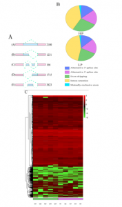 APA和AS的鑒定增強(qiáng)了我們對(duì)轉(zhuǎn)錄異構(gòu)體多樣性生物學(xué)作用的理解。在本研究中,確定了9035例AS事件,并將其分為五類(圖2)。在檢測(cè)到的全部轉(zhuǎn)錄本中,有6.86%由某種可變剪切形式產(chǎn)生,其中內(nèi)含子保留是最常見的可變剪切事件。此外,在88092個(gè)基因位點(diǎn)上進(jìn)一步確定了207955個(gè)APA事件。
