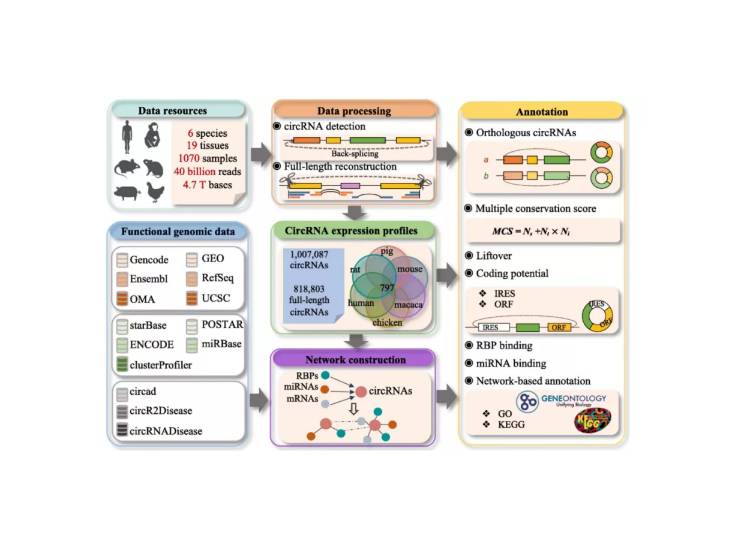 現(xiàn)有的環(huán)狀RNA (circRNA)數(shù)據(jù)庫(kù)已經(jīng)成為轉(zhuǎn)錄組學(xué)的基礎(chǔ)。但是目前常用的方法對(duì)于深度挖掘候選circRNA仍有限。基于這種情況,趙方慶教授團(tuán)隊(duì)2020年在genome biology雜志發(fā)表了circAtlas數(shù)據(jù)庫(kù)的文章(CircAtlas: an integrated resource of one million highly accurate circular RNAs from 1070 vertebrate transcriptomes)。circAtlas數(shù)據(jù)庫(kù)基于從六個(gè)脊椎動(dòng)物物種(人類,獼猴,小鼠,大鼠,豬和雞)的19個(gè)正常組織中收集的1070個(gè)RNA-seq樣本數(shù)據(jù)匯總了環(huán)狀RNA相關(guān)信息。該數(shù)據(jù)庫(kù)包含1,007,087個(gè)高度可靠的circRNA,其中81.3%以上已被組裝成全長(zhǎng)序列。數(shù)據(jù)庫(kù)終不僅概述了它們的表達(dá)模式、保守性和功能注釋等信息,還描述了一種新的多重保護(hù)評(píng)分、共表達(dá)和調(diào)控網(wǎng)絡(luò),用于circRNA注釋和排序。