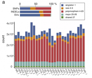 近年來,動物遺傳變異研究中,在牛、豬、狗、小鼠等物種中鑒定出了大量的SVs。例如,在62頭牛組成的群體中,鑒定得到了6,426個SVs,部分SVs位于乳品性狀的QTL內(nèi);利用全基因組測序數(shù)據(jù)構(gòu)建了豬的SVs變異圖譜,在分布全球的55個豬種的305個個體中鑒定得到了33,698個SVs,基于檢測的SVs進行選擇清除分析,在梅山豬中鑒定到64個新的受選擇區(qū)域,其中的一些位點與繁殖性狀相關(guān);2021年發(fā)表在《Communication Biology》上的研究中,作者在27個不同的狗中鑒定了14,953,199個SNPs、6,958,645個indels和217,951個SVs(圖2)。