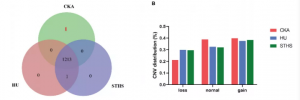 (1)例如,在416個奶山羊中鑒定得到了7,208個CNVs,GWAS分析發(fā)現(xiàn)31個CNVs所在區(qū)域與產(chǎn)奶量等性狀顯著相關(guān),并且發(fā)現(xiàn)在顯著相關(guān)的CNVs中,注釋的基因大多數(shù)在產(chǎn)奶相關(guān)的生物過程和健康相關(guān)性狀中發(fā)揮著重要作用。在另一個研究中,利用新開發(fā)的GWAScore方法整合已發(fā)表的GWAS數(shù)據(jù)來鑒定潛在的候選位點,并對3個不同品種(CKA,n=10、HU,n=10、STHS,n=9)山羊進行全基因組CNVs檢測(圖3),通過將CNVs與GWAScore和QTL位點相整合,發(fā)現(xiàn)197個候選基因與CNVs存在重疊,進一步鑒定得到28個與生長性狀相關(guān)的CNVs。